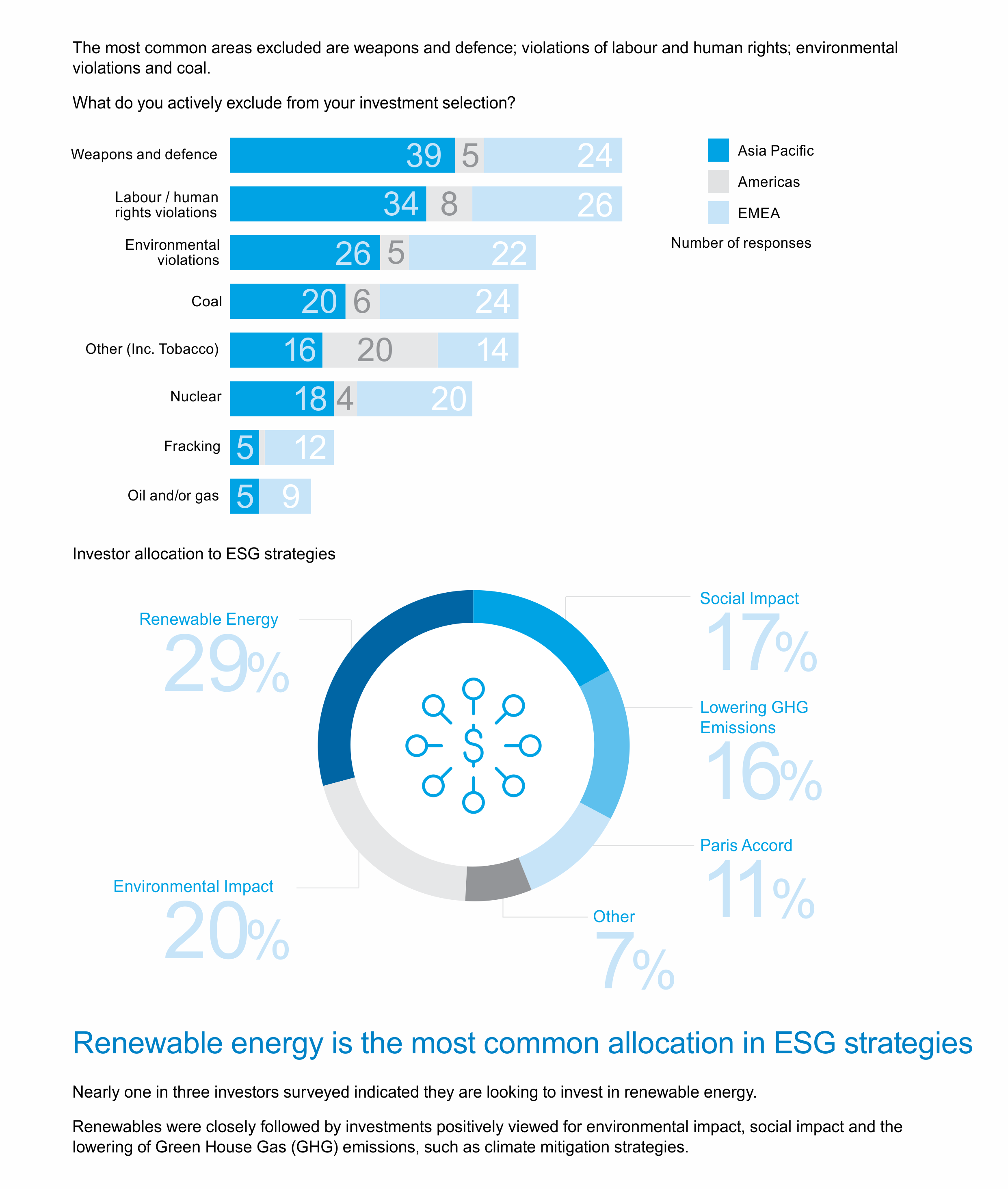 Although nearly two thirds of investors surveyed are not yet using active ESG assessment in their investment decision-making, over 90 per cent are making thematic allocations and using ESG-related exclusions to achieve their ESG investment objectives.